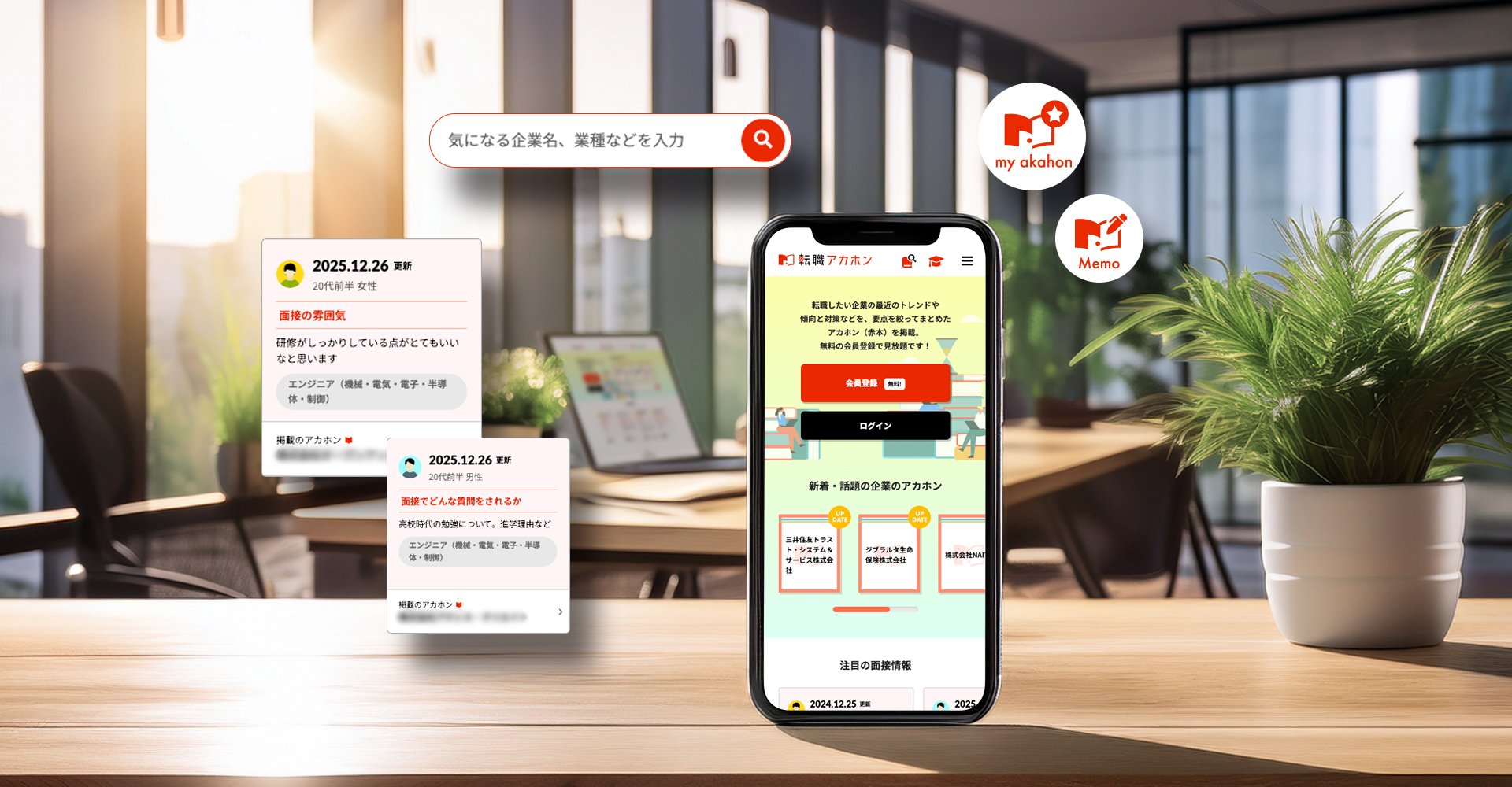 転職活動において一番の関門である面接情報に特化した情報プラットフォームを設計するにあたり、言語化したインサイトは「準備の質を上げる」、そのために設定されたキーワードは「アカホン」です。受験生なら一度は目にしたことがある対策本「赤本」がモチーフです。そこから着想を得て、プラットフォーム全体や細部をデザインしました。同時にデザインしたロゴは「アカホン」と、次へのステップという想いを込めて「ドア」「明るい光」「的(ターゲット)」を表現しています。