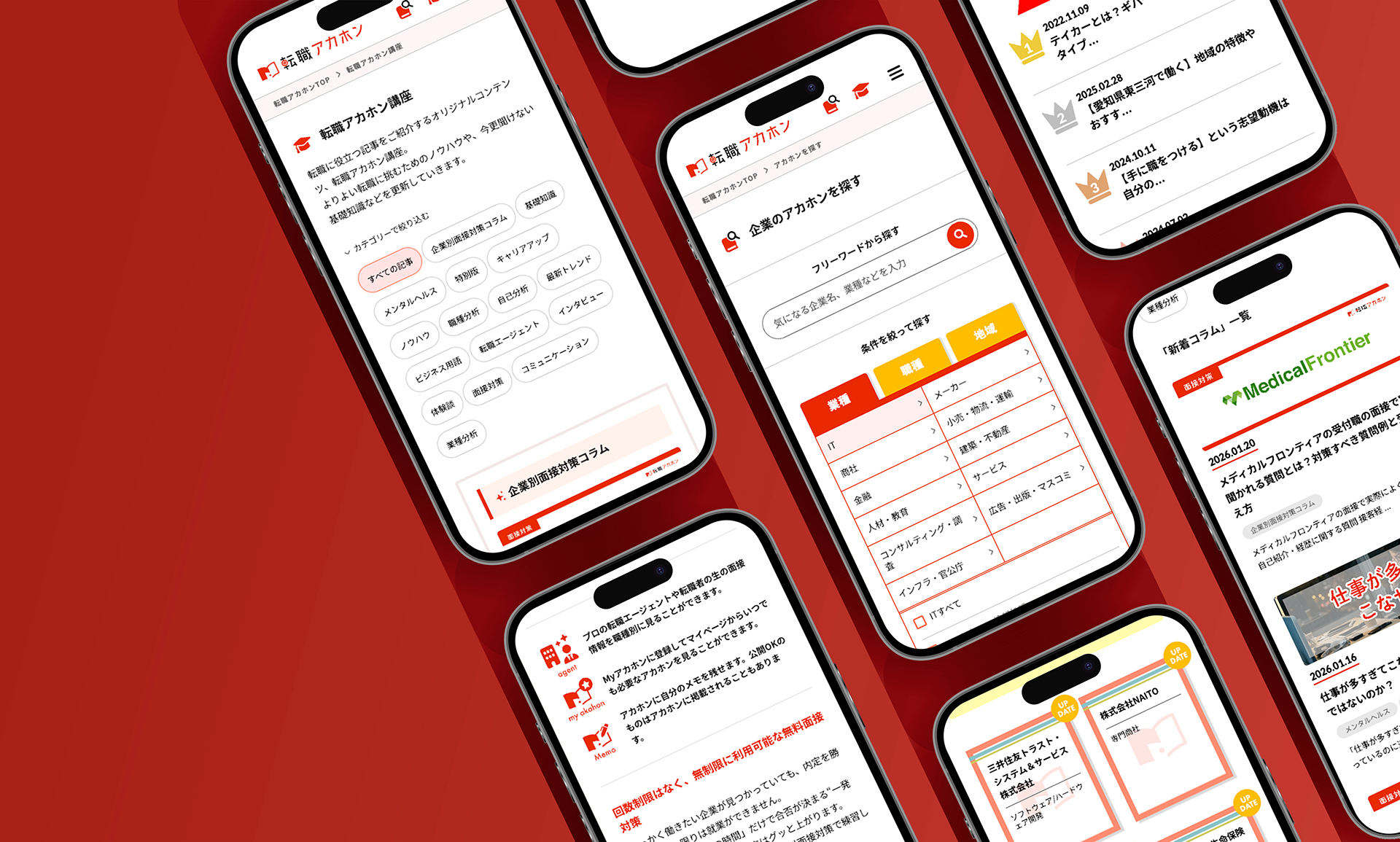 「転職アカホン」という、転職(就職)活動における“面接情報”に特化した転職者向けのウェブプラットフォーム制作プロジェクトです。運営会社は株式会社HARE(転職支援・求人紹介)。 ユーザーが求めているものは何か、それを言語化しデザインし実装することが求められました。企画段階から運用を見越した設計・デザインを提案することで、ユーザーにとって有益で拡張性のあるプラットフォームが生まれました。