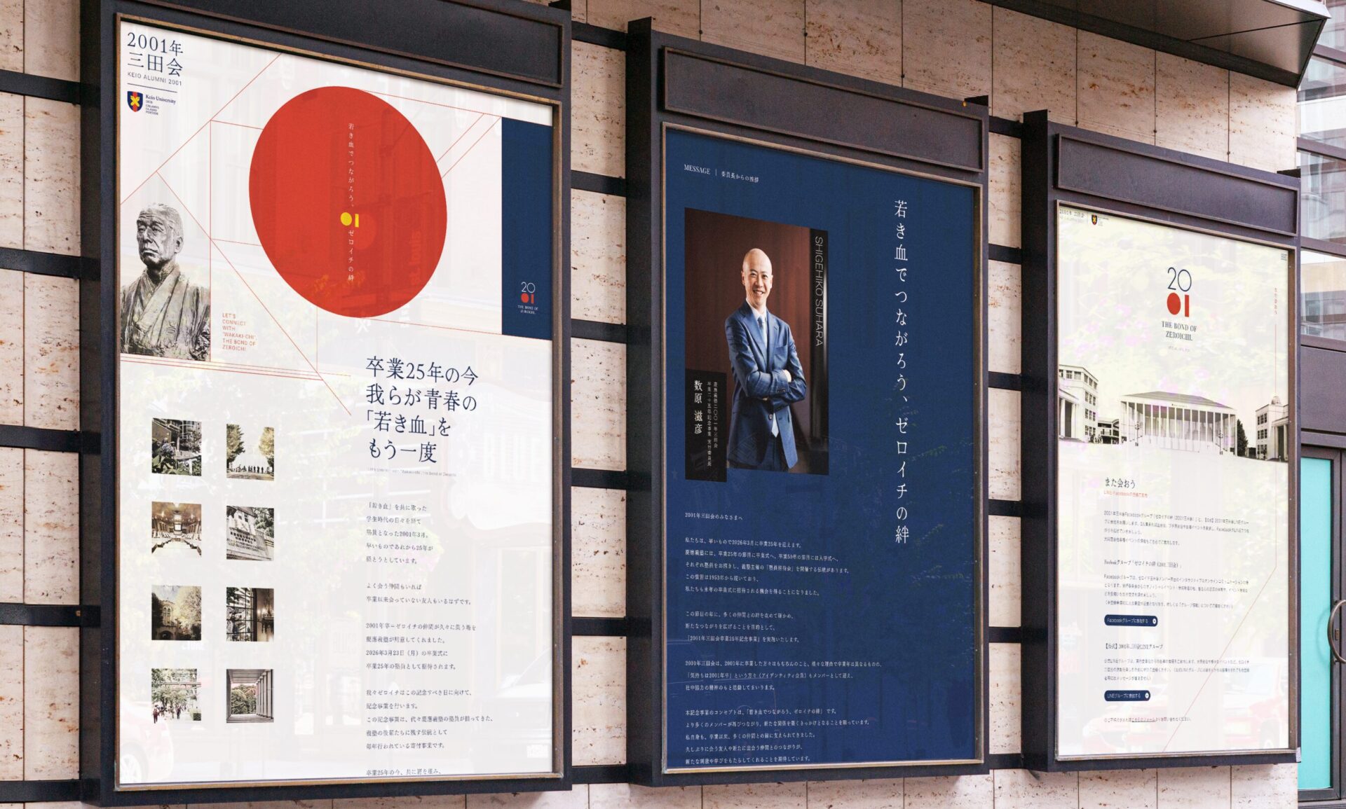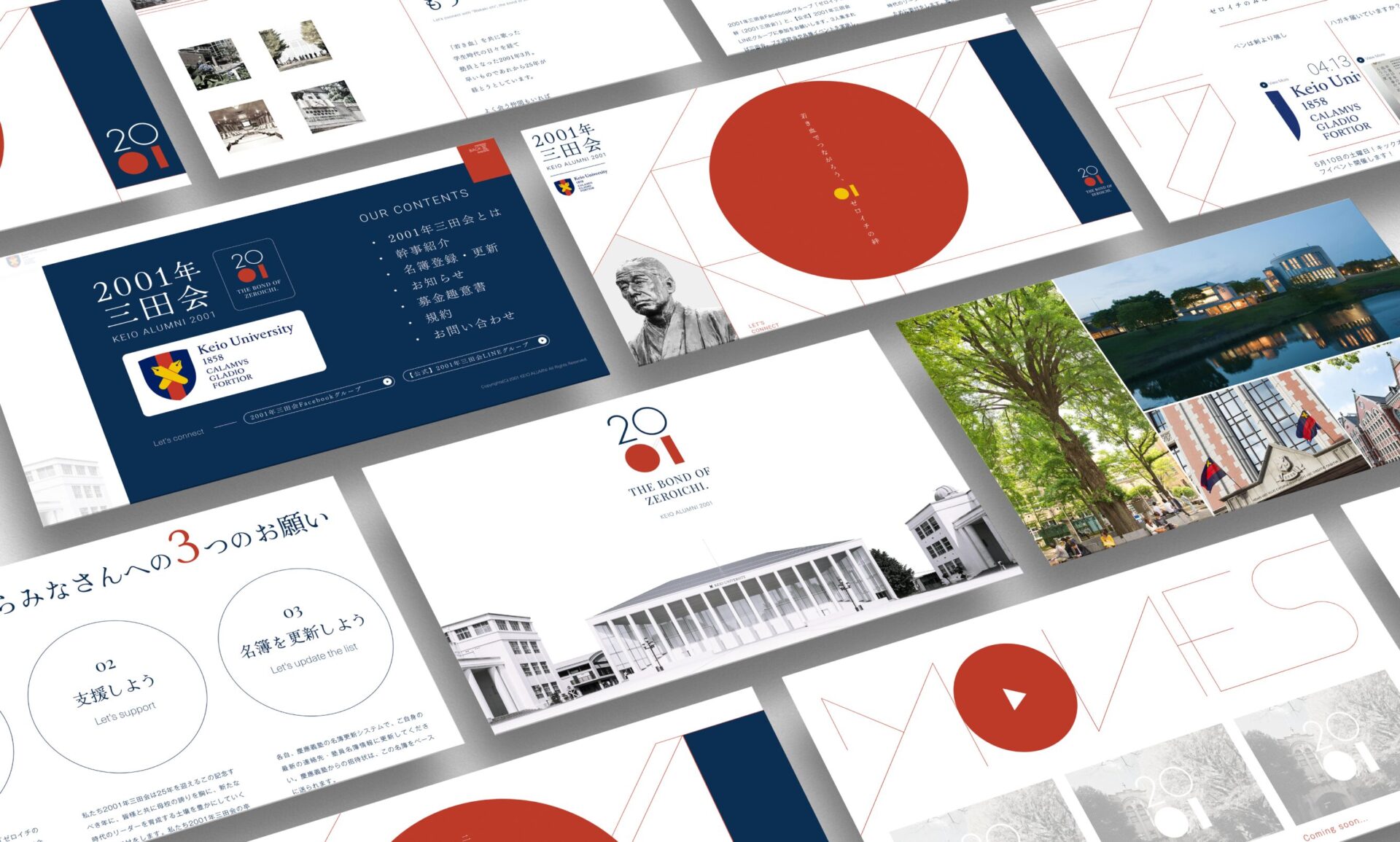 慶應義塾大学伝統のアルムナイ(同窓会)のウェブサイト制作です。2001年卒業生で構成される2001年三田会。2026年3月に卒業25周年を迎え同校卒業式に招待されることを記念し、同会の結束と後輩へのエールを目的として企画されたウェブサイト制作です。